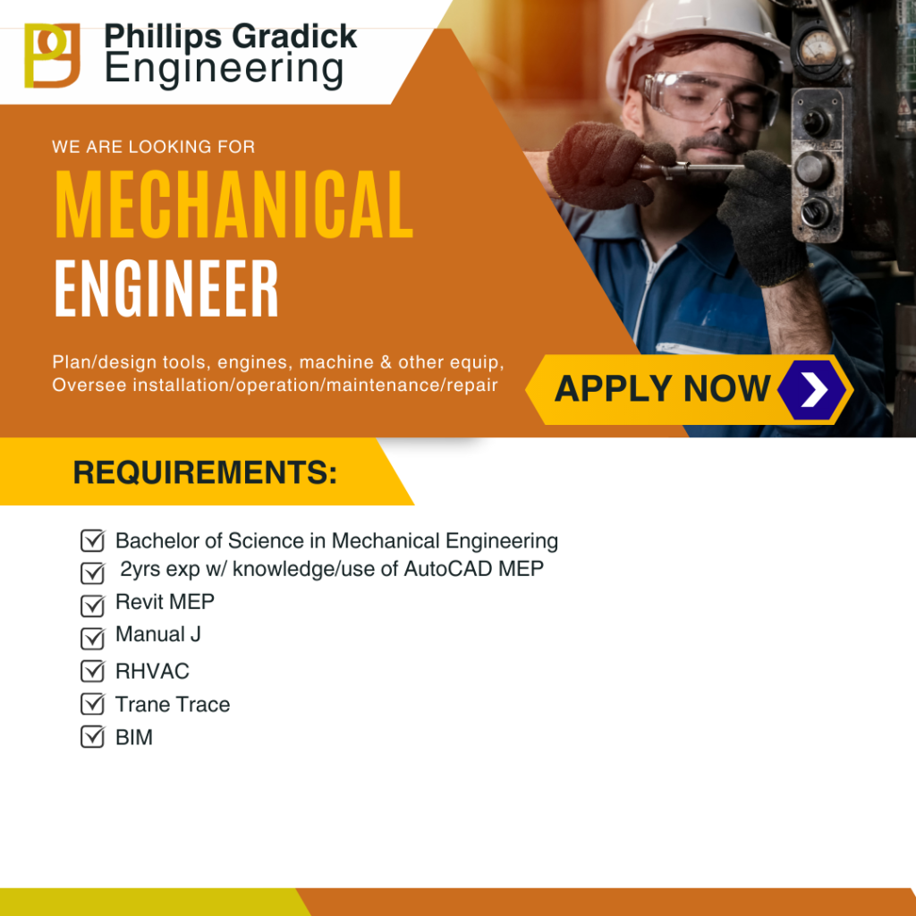 Are you a skilled Mechanical Engineer ready to make a meaningful impact? We’re seeking a talented individual to join our team at Phillips Gradick Engineering! As a Mechanical Engineer, you’ll play a crucial role in planning, designing, and overseeing the installation, operation, maintenance, and repair of tools, engines, machinery, and other equipment.